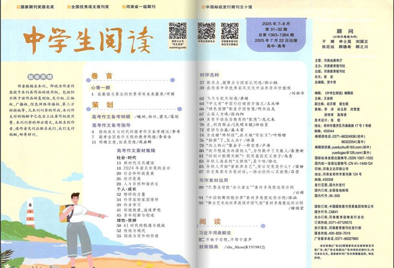 除了文章,杂志还会设置一些互动和练习的板块,帮助中学生巩固所学和提高技能。这些板块可能包括阅读理解题、写作练习、讨论话题等。通过参与这些互动,中学生可以进一步培养他们的阅读能力和思维能力。《中学生阅读》杂志致力于为中学生提供有趣而深入的阅读内容,帮助他们培养阅读兴趣、拓展知识,培养批判性思维和社会责任感。这本杂志不仅是一个娱乐和学习的工具,也是中学生们开拓视野、丰富人生的重要伴侣。